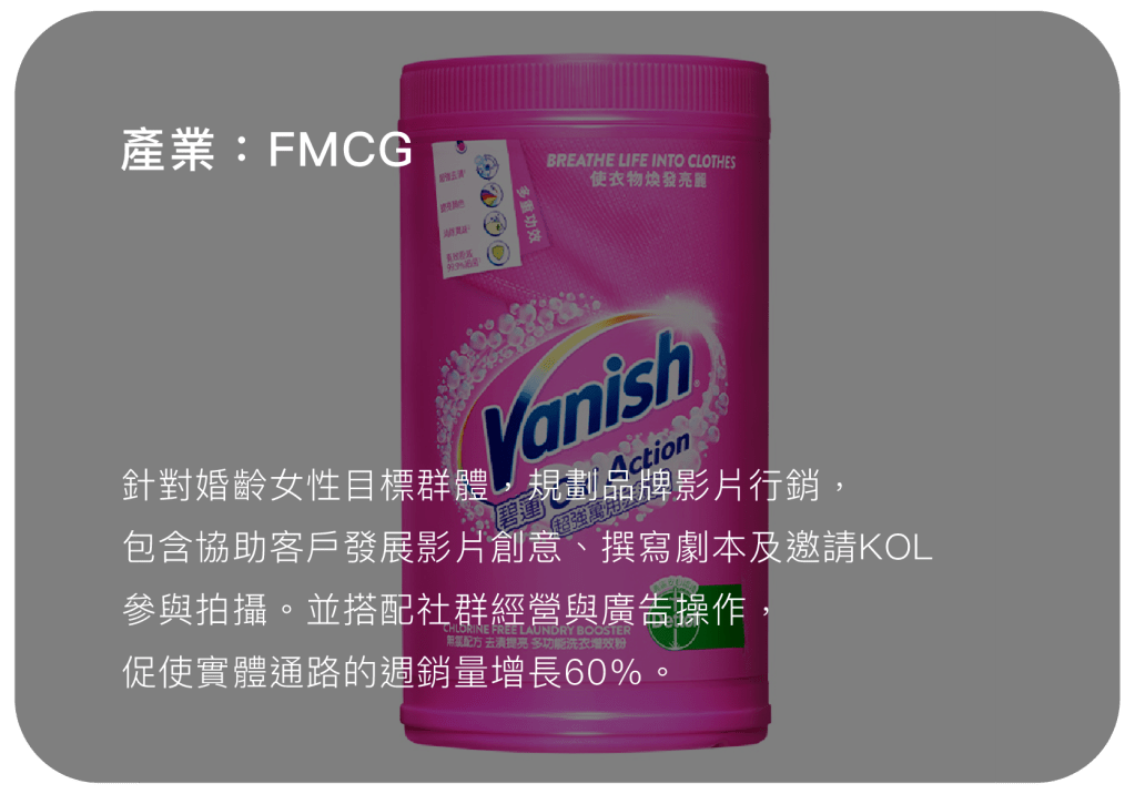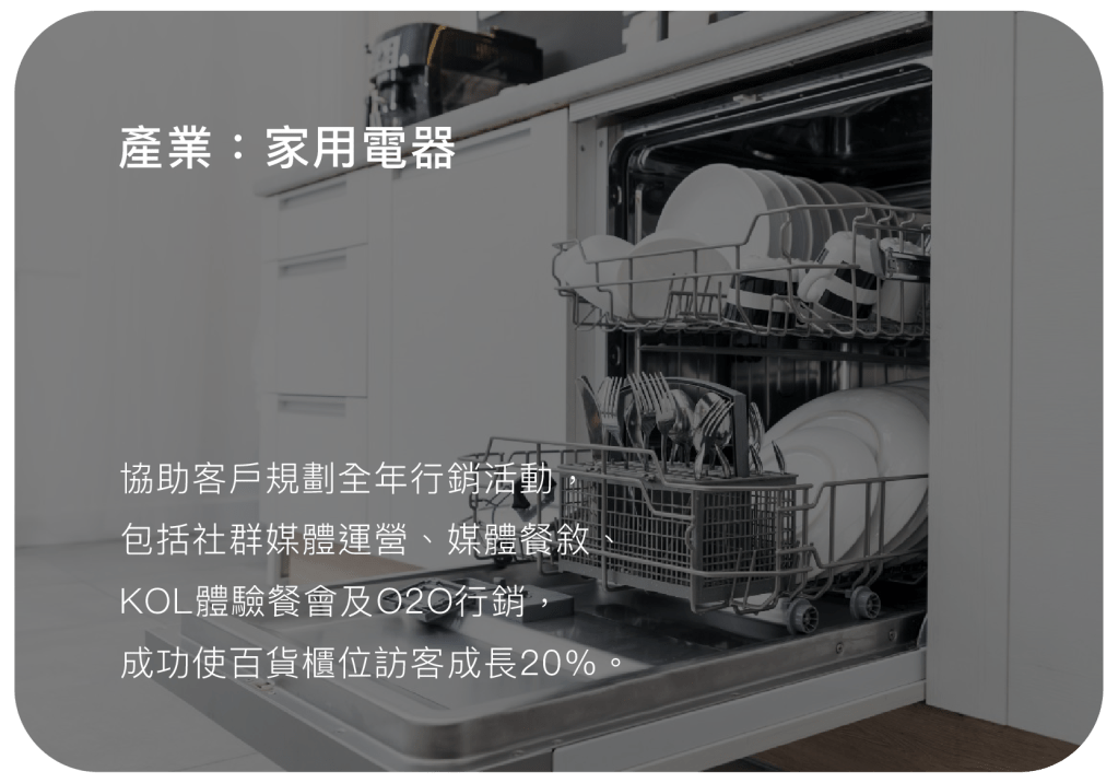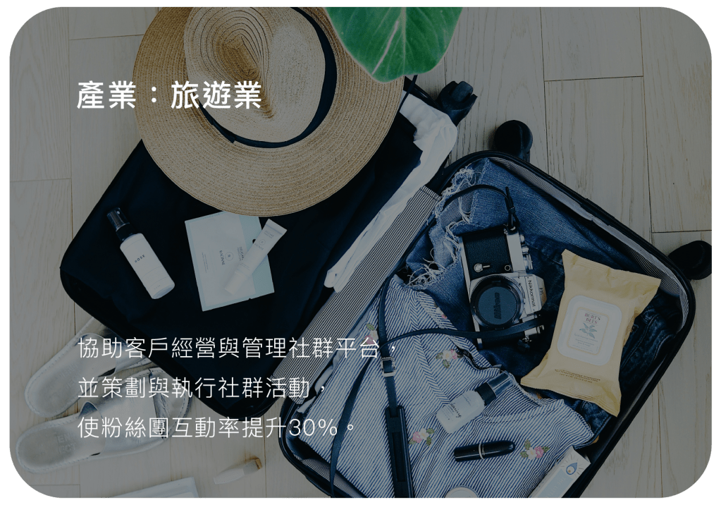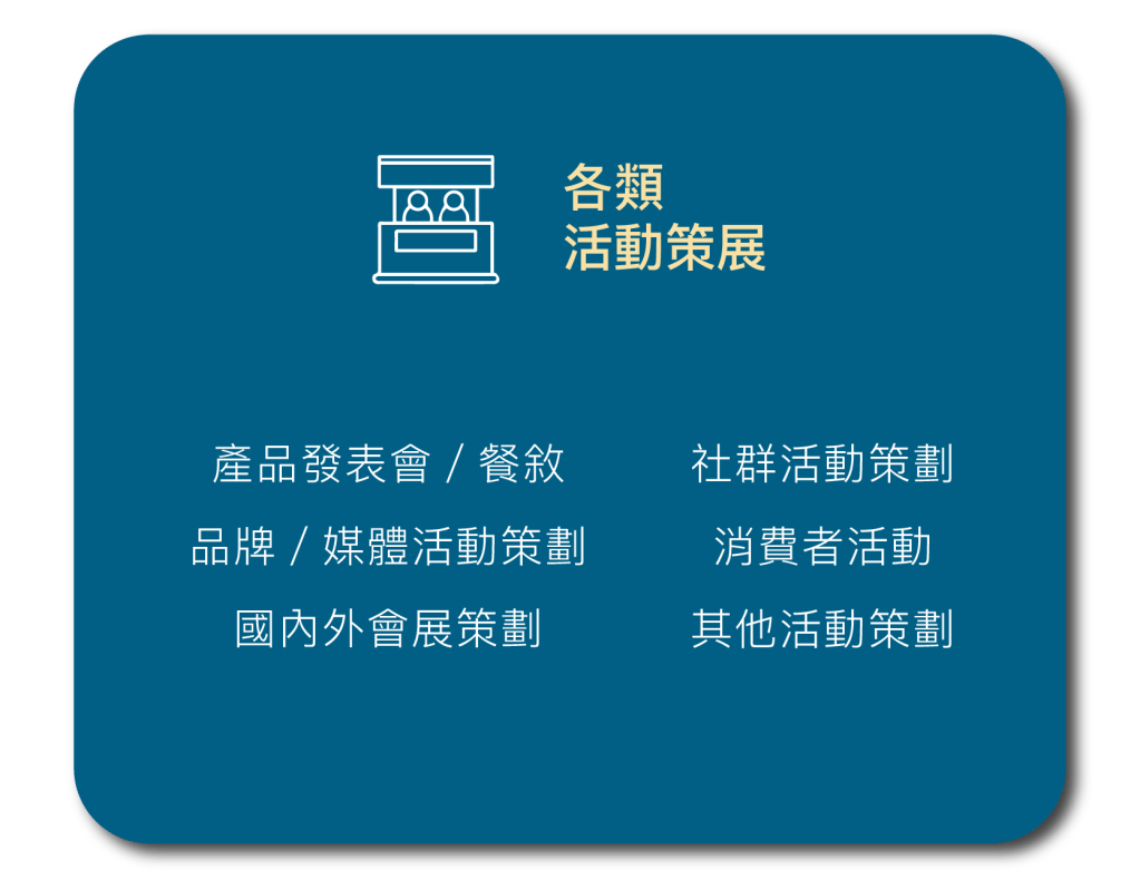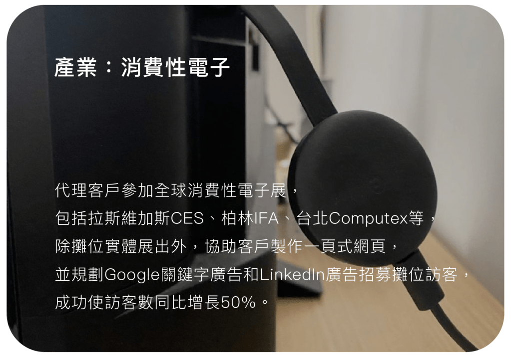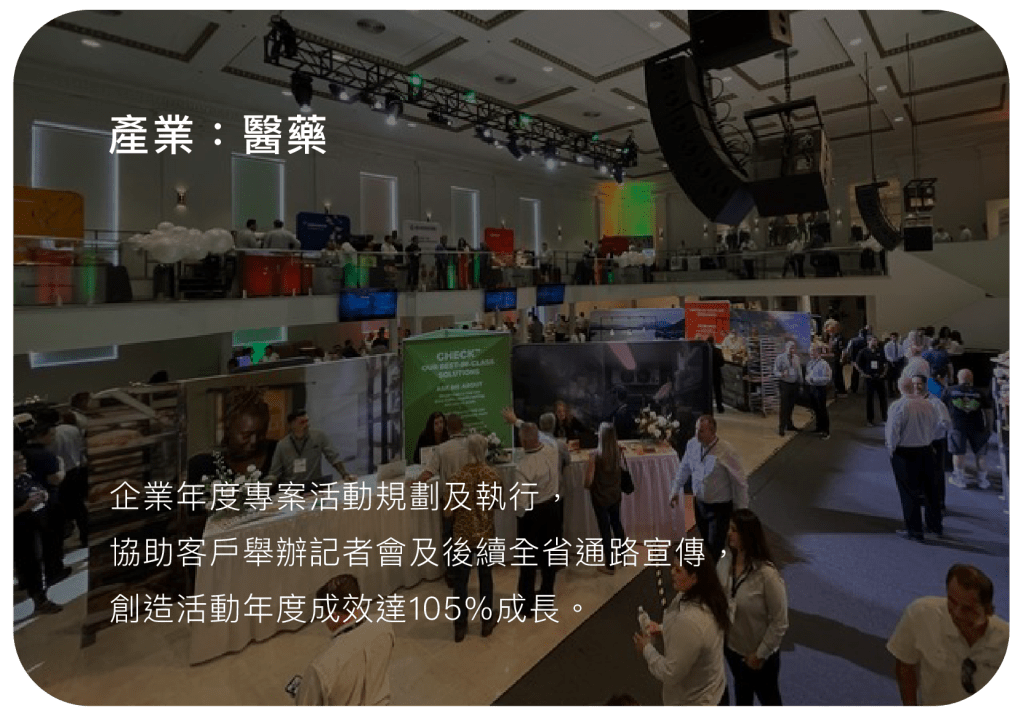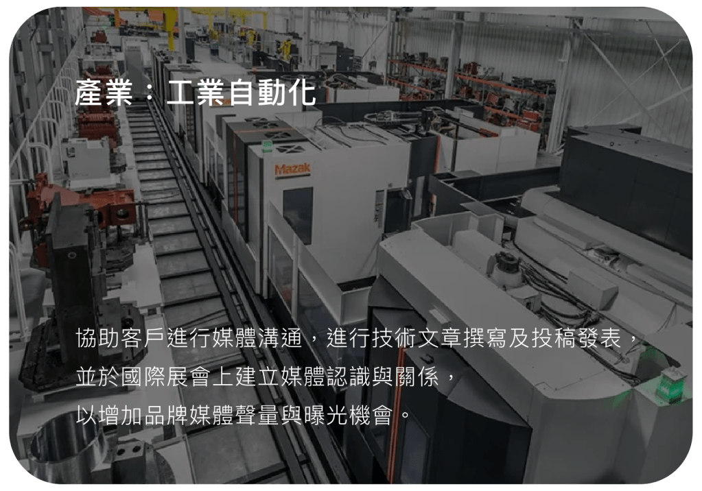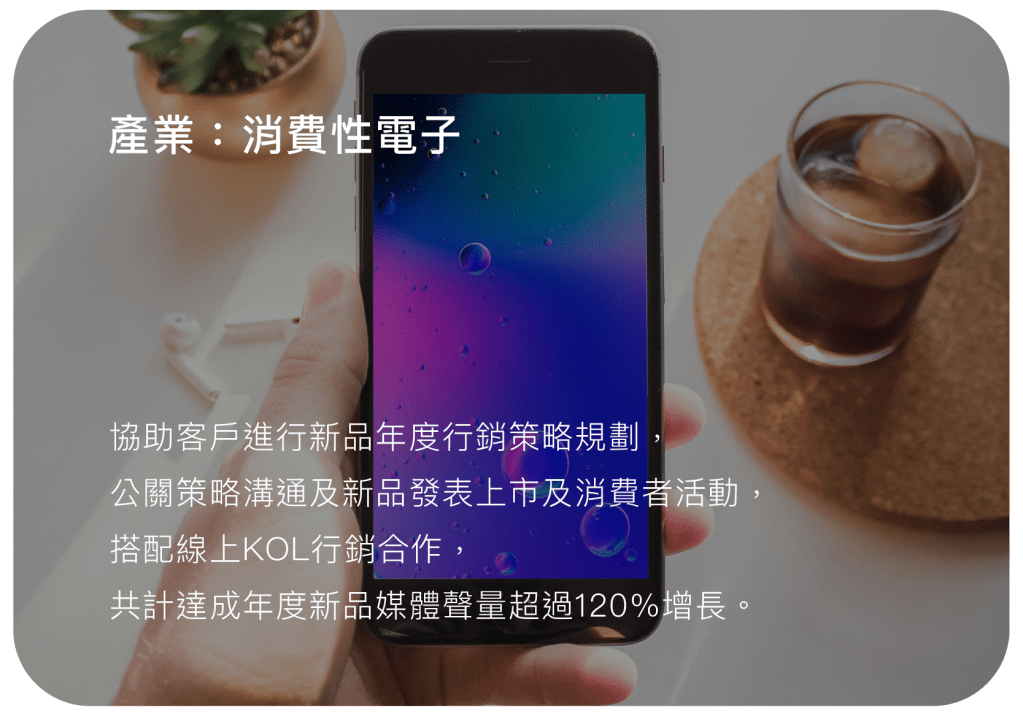 我們專注於消費性電子、金融、醫藥、旅遊、FMCG 、半導體等產業,涵蓋範圍包含品牌行銷、議題公關、廣告規劃操作、跨境電商及各類活動策展等,能夠為客戶更快速的提供於國際市場進入策略,增加市場份額和競爭優勢。